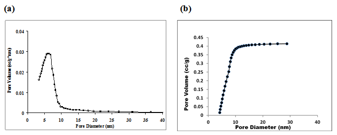 Pore size distribution can be represented both in differential and cumulative ways. The Fig. 4(a) shows the differential BJH pore distribution of titania sample calcined at 4000C. The figure shows that for the given sample pores were in the range of 2-10 nm. The corresponding cumulative pore distribution is shown in Fig. 4(b).