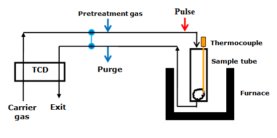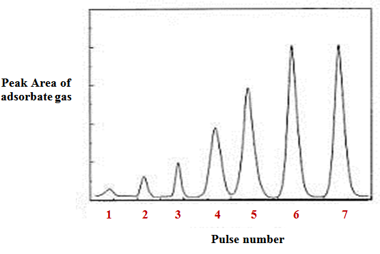 In pulse chemisorption technique, initially the sample is reduced with hydrogen at elevated temperature to convert the oxide to metallic form (such as NiO to Ni). Then, the sample is flushed with an inert gas at elevated temperature, such as helium, to remove traces of any adsorbed gases. Then, sample is cooled to the analysis temperature, with inert gas flowing. Successive small pulses of adsorbate gas (of known volume) are injected in the flow of inert gas by a syringe or loop at the desired temperature. Pulses of adsorbate gas are continued to be inject ed until the catalyst surface is saturated. The Fig 2 shows a typical plot of peak area of adsorbate gas as function of number of pulse injected. As the figure shows, the first pulse corresponds to negligible peak area suggesting that most of the injected gas is adsorbed. For second pulse the peak area increased compared to the first suggesting lesser amount of gas adsorbed compared to first injection. As the number of pulse increases peak area gradually increases corresponding to decreased amount of gas being adsorbed. Finally the peak area becomes constant corresponding to the area of pulse volume. The constant areas are shown by pulse number 6 and 7 in the Fig 2. The amount of gas adsorbed is obtained by calculating the difference between the volume of each pulse and the fraction of H2 not adsorbed. The total amount of gas chemisorbed can be obtained from the number of consumed pulses. The schematic diagram of equipment for pulse chemisorption is given in Fig. 3.