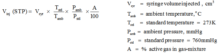 1. The volume of active gas (CO or H2) injected ,Vinj , can be calculated at STP conditions using the equation below. Generally, the active gas is used as a gas mixture, such as 10% CO in helium or 10 % H2 in argon.