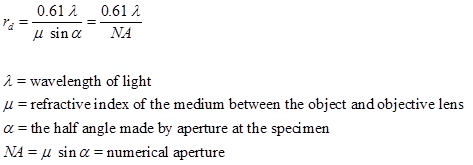(b) Resolution (rd) is defined as closest spacing of two points which can be clearly seen through the microscope as separate entities. Resolution can be determined as: