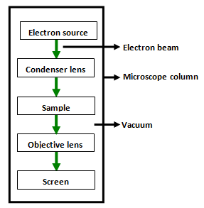 The Fig. 1 shows the arrangement of components for transmission electron microscope. An electron gun at the top of the microscope emits electrons that travel through vacuum in the microscope column. Vacuum is essential to prevent strong scattering of electrons by gases. Electromagnetic condenser lenses focus the electrons into a very thin beam. Electron beam then travels through the specimen and then through the electromagnetic objective lenses. At the bottom of the microscope, unscattered electrons hit the fluorescent screen giving image of specimen with its different parts displayed in varied darkness, according to their density. The image can be studied directly, photographed or digitally recorded.