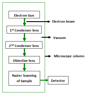 In SEM, there are several electromagnetic lenses, including condenser lenses and one objective lens. Electromagnetic lenses are for electron probe formation, not for image formation directly, as in TEM. Two condenser lenses reduce the crossover diameter of the electron beam. The objective lens further reduces the cross-section of the electron beam and focuses the electron beam as probe on the specimen surface. Objective lens thus functions like a condenser. This is in contrast to TEM where objective lens does the magnification.