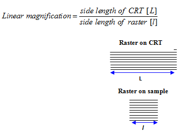 In SEM, image is not magnified by any lens as opposed to TEM where magnification is determined by power of the objective lens. Magnification of SEM is determined by the ratio of the linear size of the display screen to the linear size of the specimen area being scanned. Raster displayed on the CRT is larger than the corresponding Raster scanned by the electron beam on the specimen (Fig 4). The linear magnification is given by
