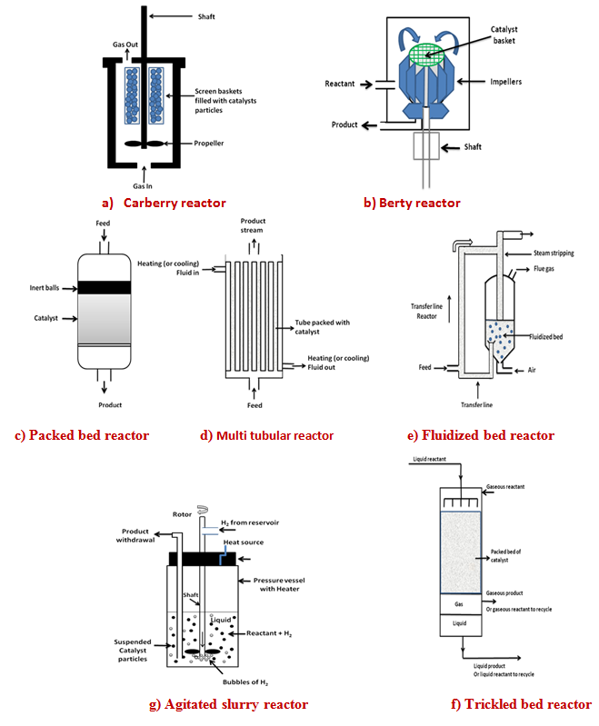 In trickled bed reactor gaseous and liquid reactants flow co-currently downward over a packed bed of solid catalyst particles. The liquid is distributed across the reactor cross section by a distributor plate. The gas enters at the top and distributed along with the liquid. The liquid flows downward by gravity and drag of the gas. For low liquid flow rates and low to moderate gas flow rates, the gas phase is continuous with liquid trickling down forming film over the solid catalyst. The thickness of the liquid film has been estimated to vary between 0.01 and 0.2 mm. This flow regime is known as a trickle flow regime. The fluid approaches plug flow leading to higher conversion than slurry reactors for the same reactor volume. Other advantages include ease of installation, minimal catalyst handling and low catalyst attrition as in packed bed reactor. Disadvantages include maldistribution of flow resulting in channeling or bypassing, possibility of non uniformity in packing, incomplete contacting or wetting and intraparticle diffusion resistance. Catalyst bed depth is limited by pressure drop, catalyst crush strength and maximum adiabatic temperature increase for stable operation. The reactor length to diameter ratio can vary between 1 and 10 depending on the allowable pressure drop. Other parameters important for trickled bed include void fraction of bed, holdup for phases, wetting efficiency (fraction of catalyst wetted by liquid), gas – liquid mass transfer coefficient, liquid–solid mass transfer coefficient, liquid and gas mixing, pressure drop and heat transfer coefficients. The wetting efficiency of the catalyst is important for reaction rate and increases with increasing liquid rate. The trickle bed reactor is most commonly used for hydrogenation and hydrodesulfurization reactions.