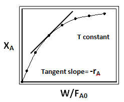 In this method the data are collected as in previous case. A plot of conversions XA versus W/FAo is made for each set of runs at a fixed temperature (Fig. 2). A best fit of data is made. Tangent to the fitted curve are drawn at regular interval along the curve corresponding to the best fit. The slopes of this tangent are evaluated which correspond to the reaction rate
