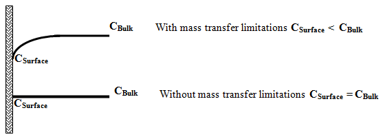 Transfer of reactants from bulk fluid to surface of catalyst particles depends on the concentration difference which is affected by the velocity pattern of fluid near the catalyst surface, physical properties of fluid and intrinsic rate of chemical reactions. While the fluid properties affect the mass transfer between fluid and catalyst surface, the intrinsic rate is determined by the condition and properties of catalyst. The external concentration profiles for reactant for solid catalytic reaction in absence and presence of mass transfer limitation is shown in Fig. 1. In absence of mass transfer there is no difference in concentration of reactant at bulk and near the catalyst surface. However, presence of significant mass transfer resistance results in a decrease in the concentration of reactants at the catalyst surface compared to that in the bulk fluid. Consequently, the observed rate is less than the intrinsic rate evaluated at bulk fluid reactant concentration.