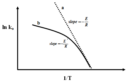 If the Arrhenius equation is plotted over the entire range of temperature, then at low temperatures, the slope corresponds to the correct (or true) activation energy E of the surface reaction. As temperature increases, a curve is obtained, which flattens to a horizontal line corresponding to constant value of ‘