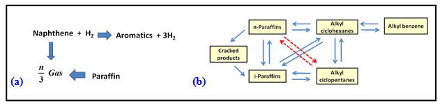 Reforming involves simultaneous occurrence of several reactions thereby making mechanism of reforming very complex. Lumped kinetic models are used in which naphtha components are lumped into functional groups i.e. alkanes, naphthenes and aromatics. Some of the reaction scheme used to develop catalytic reforming kinetic model is shown in Fig.2