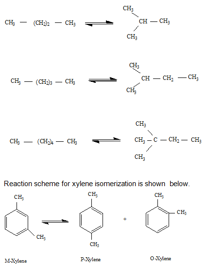 The isomerization reactions of butane, pentane and hexane are as follows.