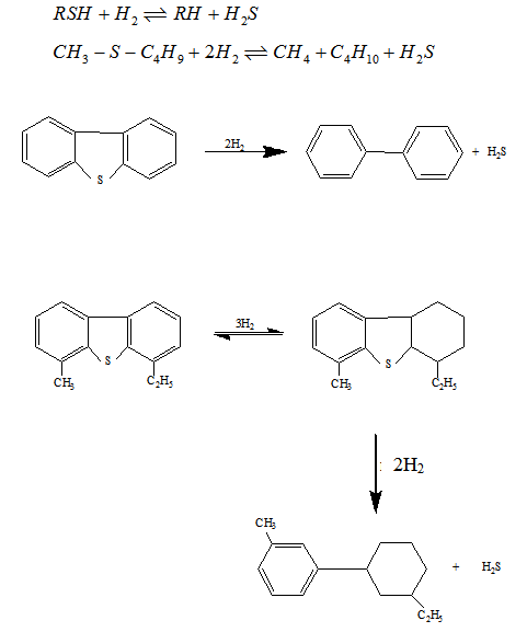 - 1. Hydrodesulphurization (HDS): HDS can occur by direct removal of sulfur as H2S or unsaturated complex molecule may initially undergo partial hydrogenation followed by sulfur removal.