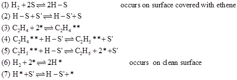 Hydrogen adsorbed dissociatively on the Pt surface at ‘S' or ‘*' adsorption sites forming H-S' or ‘H*'. The adsorbed hydrogen atom ‘H-S' or ‘H*' were further assumed to be activated on another site Sˈas shown by step 2 or 7. The activated hydrogen H-Sˈ then can react with C2H4 ** to give C2H5** (step 4) and then with C2H5** to give C2H6 (step 5). The Step 5 was considered as slowest and rate determining step.