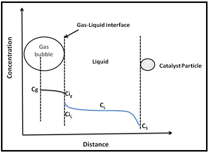 Hydrogenation of organic compounds is usually conducted in liquid phase in a slurry reactor. Most hydrogenation reactions are highly exothermic and hence careful temperature control is required. Solvent is used to affect the product selectivity and to absorb the liberated reaction heat. Hydrogenation reactions in the slurry reactor are typically limited by mass transfer of H2 from gas bubbles through liquid to each suspended catalyst particle. For hydrogenation reaction to occur, the hydrogen has to be transported from bulk phase to liquid phase through gas – liquid interface and then from bulk liquid to surface of solid catalyst for final reaction. The Fig. 3 schematically shows the various concentrations of hydrogen at different positions for a single bubble and particle combination. The Cg, CL and Cs shown in the figure represent concentration of hydrogen in gas bubble, liquid and catalyst surface respectively.