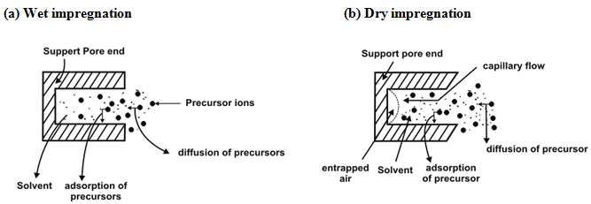Mechanism of impregnations: The mechanism of wet impregnation is simpler compared to dry impregnation. In wet impregnation the distribution of the solute inside the pores is assumed to be governed by two phenomena (Fig. 1):