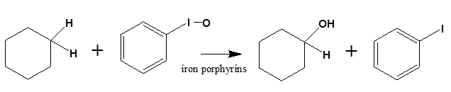 The hydroxylation of unactivated alkanes can be done in presence of iodosylbenzene and iron porphyrins catalyst. The oxidation of cyclohexane in presence of iodosylbenzene with chloro(5,10,15,20-tetra-o-tolylporphyrinato)iron(III) [Fe(TTP)CI] produce cyclohexanol and cyclohexanone as show below.