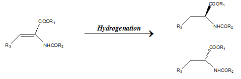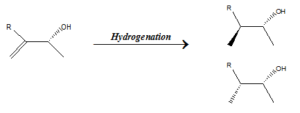 For a substrate containing a stereogenic centre the catalysts can direct the addition of atoms to give two diastereomers. The selectivity for either diastereomer is called diastereoselectivity. For example the addition of dihydrogen as shown below gives two diastereomers.