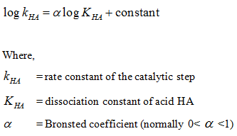 α indicates the sensitivity of catalytic step for changes in acid strength of HA. Similarly Brønsted relation for general base catalysis is