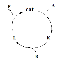 For example the cycle of a catalytic reaction A+B →P, having intermediates K and L can be represented as