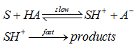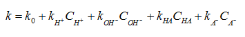 Reaction rate is dependent on all acids/bases present in solution. Rate constant for reaction is function of concentrations of H+, OH−, HA and A− . First order rate constant can be calculated from