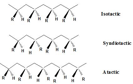 These polymers are synthesized from single monomer such as alkene (propylene, vinylchloride, styrene) or dienes (butadienes). Different stereochemical arrangements of substitutional R group around the carbon chain as shown in Fig. 1 result in polymers with variation in properties. In isotactic arrangement substitutional R group lies on the same side of the carbon chain as shown in Fig.1. In syndiotactic form R group alternate on either side of the carbon chain. When there is random arrangement of the substitutional R group on carbon chain the arrangement is known as atactic. The stereoregularity of polymer has significant effect on the properties of polymers. Isotactic and syndiotactic are crystalline where as atactic polymer are amorphous. Polypropylene exists in these forms. Isotactic polypropylene polymer is semicrystalline material while atactic polypropylene has rubber like properties.