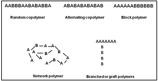 Copolymers are prepared from two or more type of polymers. Different types of copolymers are obtained depending on the sequence of bonding of two different homochain polymers say A and B as shown in Fig. 2. Random copolymers have lower crystallinity and greater elasticity. In block polymer, blocks of one type of homopolymer structure are attached to blocks of another type of homopolymer. As a result in block polymer, desirable properties from each of the co-monomers are obtained. The styrene-butadiene thermoplastic elastomer is an example of block polymer while t he acrylonitrile-butadiene-styrene (ABS ) impact polymer is an example of network polymer.