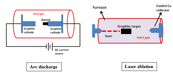 The electric arc discharge method is one of the efficient techniques for synthesis of CNT. Typically, about 60 to70 wt% of the arc-synthesized soot is CNT. The rest of the soot comprises of fullerenes, amorphous carbon and catalyst nanoparticles. In electric arc discharge production of CNT two graphite rods are used and a current is passed continuously between the electrodes. The anode is drilled and filled with catalysts. The metal oxides (Ni, Co, Fe) are used as catalyst. In some cases the catalyst/graphite composite is used as electrode. The synthesis is performed in cooled chamber in presence of helium, argon or methane environment. During the arcing, the catalyst/graphite anode is evaporated and consumed with simultaneous carbon deposition around the cathode. The quality of CNT samples depends upon arc stability, current density and cooling of cathode. In laser ablation method the graphite target is subjected to laser and sublimated carbon is recollected. Inert gas atmosphere is maintained within the chamber.