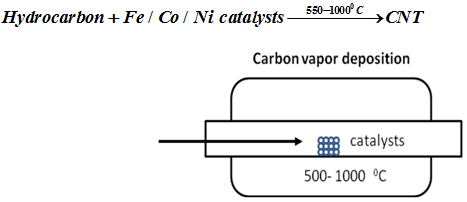 The most used method to prepare CNT is pyrolysis of hydrocarbon gases or vapors such as propane, butane, hexane, benzene, toluene etc. The method is also known as chemical vapor deposition (CVD) process.