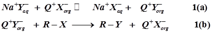 Phase transfer catalysis (PTC) refers to reaction between two substances, located in different immiscible phases, in the presence of catalyst. Phase transfer catalysis is mainly used for synthesis of organics such as pharmaceuticals, dyes, chemicals etc. In this process one phase acts as a reservoir of reacting anions. The second phase, which is the organic phase, contains the organic reactants and catalysts generating lipophilic cations. The reacting anions enter the organic phase in ion pairs with lipophilic cations of the catalyst. Since the phases are mutually immiscible the reaction does not proceed unless the catalyst, usually a tetra alkyl ammonium salt, Q+X– is present. The catalyst transfers reacting anions into the organic phase in form of lipophilic ion-pairs produced according to the ion-exchange equilibrium (1a). In the organic phase the anions react such as in nucleophilic substitution as shown in 1(b) where alkyl halides undergo nucleophilic substitution. A variety of other reactions with participation of inorganic anions such as addition, reduction, oxidation, etc. can take place efficiently using this methodology.