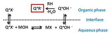 According to this mechanism phase transfer catalyst moves back and forth across the organic and aqueous phases. The onium salt (Q+X–) equilibrates with inorganic base (MOH) in aqueous phase, and extracts hydroxide into organic phase. Onium hydroxide (Q+OH–) then abstracts hydrogen from the acidic organic compound to give the reactive intermediate Q+R–.