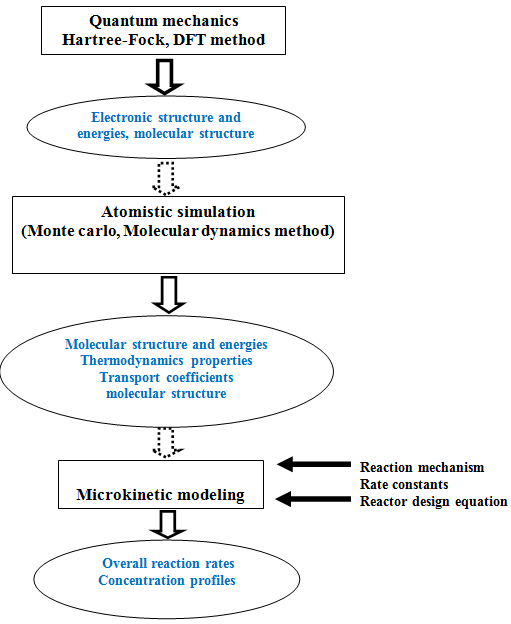 Microkinetic modeling is used to link molecular-level informations about reactants, products and reactive intermediates on heterogeneous surfaces obtained by atomistic simulations and electronic structure calculations to macroscopic physical and chemical phenomena in systems involving chemical transformations. It is done using model parameters such as reaction rates, reactant conversion, product yields and selectivities predicted by the previous levels.