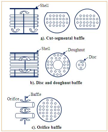 Figure 1.6. Different type of heat exchanger baffles: a). Cut-segmental baffle, b). Disc and doughnut baffle, c). Orifice baffle