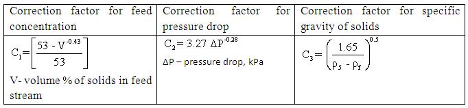 Where, q – slurry feed rate, lit/min; D- diameter of cyclone, cm; du -internal diameter of underflow, cm; ΔP- pressure drop between inlet and over flow outlet, kg/cm2 ; ρs – density of slurry, kg/cm3.