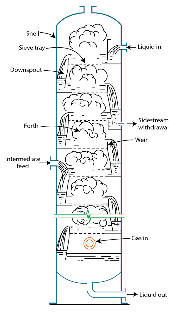 Plate contractors/ towers are vertical cylindrical columns in which a vertical stack of trays or plates are installed across the column height as shown in Figure 7.1. The liquid enters at the top of the column and flows across the tray and then through a downcomer (cross-flow mode) to the next tray below. The gas/vapor from the lower tray flows in the upward direction through the opening/holes in the tray to form a gas-liquid dispersion. In this way, the mass transfer between the phases (gas/vapor-liquid) takes place across the tray and through the column in a stage-wise manner.