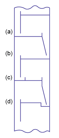 Figure 8.3. Design of segmental downcomers: (a) vertical apron, (b) inclined apron, (c) inlet weir and, (d) recessed well ( [1] page 563 ).
