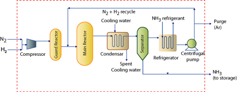 | a) Reaction: The Haber process combines nitrogen from the air with hydrogen derived mainly from natural gas (methane) into ammonia. The reaction is reversible and the production of ammonia is exothermic. Nitrogen and hydrogen will not react under normal circumstances. Special conditions are required for them to react together at a decent rate forming a decent yield of ammonia. These conditions are T = 400°C; P = 200 atm; Iron catalyst with KOH promoter. b) Raw materials: H2 from synthesis gas, N2 from synthesis gas/air liquefaction process c) Process technology: Illustrated in Figure 1.1 d) Unit processes: Feed Guard Converter; Main Reactor e) Unit operations in the technology: Condensation/Gas Liquefaction; Separation; Refrigeration; Centrifugal Re-circulator f) Striking feature: Conversions are low (8 - 30 % per pass) and hence large recycle flow rates exist. g) Functional role of various processes |