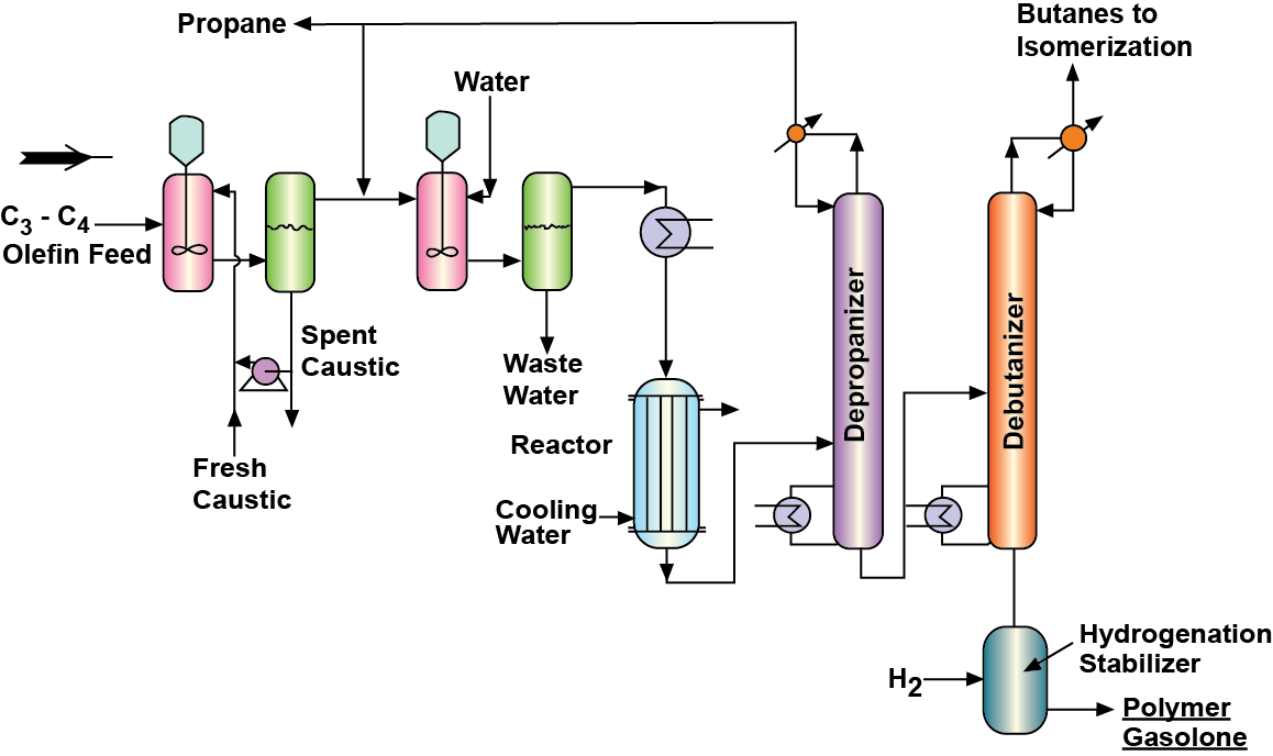 Fractionation: Subsequently, the reactor product is fed to a depropanizer and debutanizer to produce propanes, butanes and polymer gasoline. The polymeric product is further stabilization using hydrogenation stabilizer which converts any freely available double bonds to single bonds. The end product is polymer gasoline.