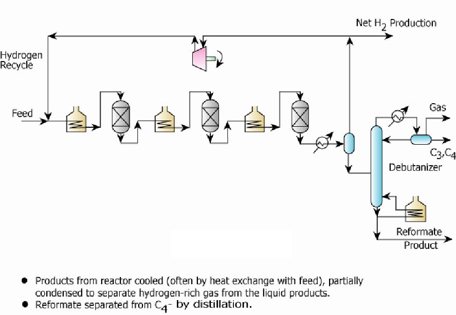 • The liquid stream from the phase separator is sent to a debutanizer distillation column that separates butanes and lower alkanes from the reformate product.