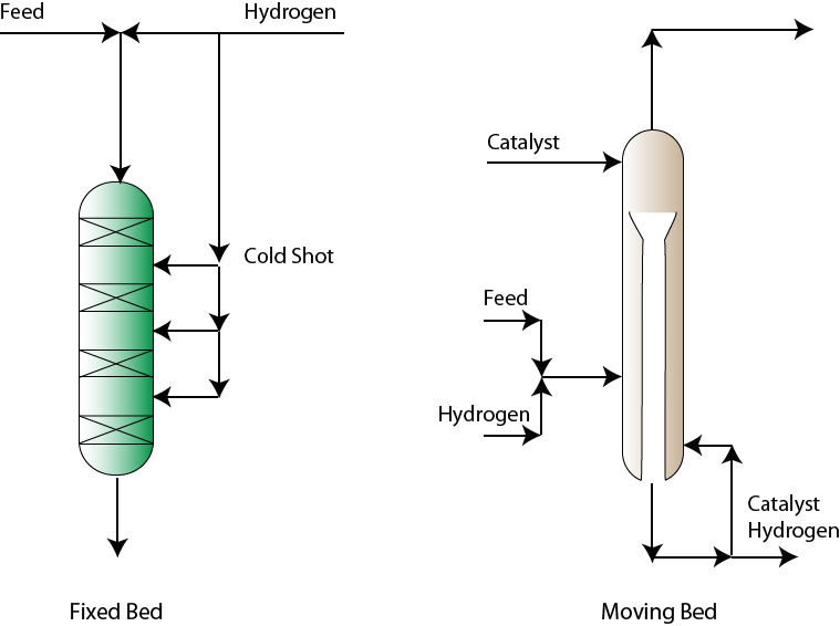 • Packed beds: Cold shot reactors are used in which cold H2 is used to cool the hot streams. Guard reactors are used before hydrocracking catalyst within the reactor column itself