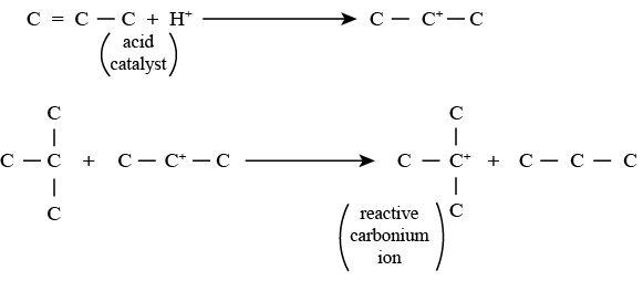 • Step 1 involving Carbonium ion formation: In this reaction, alkene reacts with a proton (acid catalyst) to produce a proton substituted olefin. The proton substituted olefin reacts with isoparaffin to generate a reactive carbonium ion and alkane.