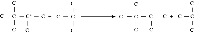 • Step 3 involving regeneration of carbonium ion: In this reaction, the intermediate carbonium ion reacts with the isoparaffin to produce alkylate product and carbonium ion. Thus carbonium ion is again regenerated to take part in step 2 reactions along with other additional unreacted olefin molecules.