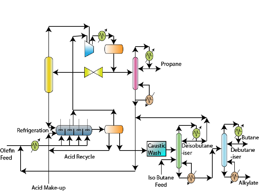 • In an alkylation process, olefins are reacted with isoparaffins to yield alkylate product.