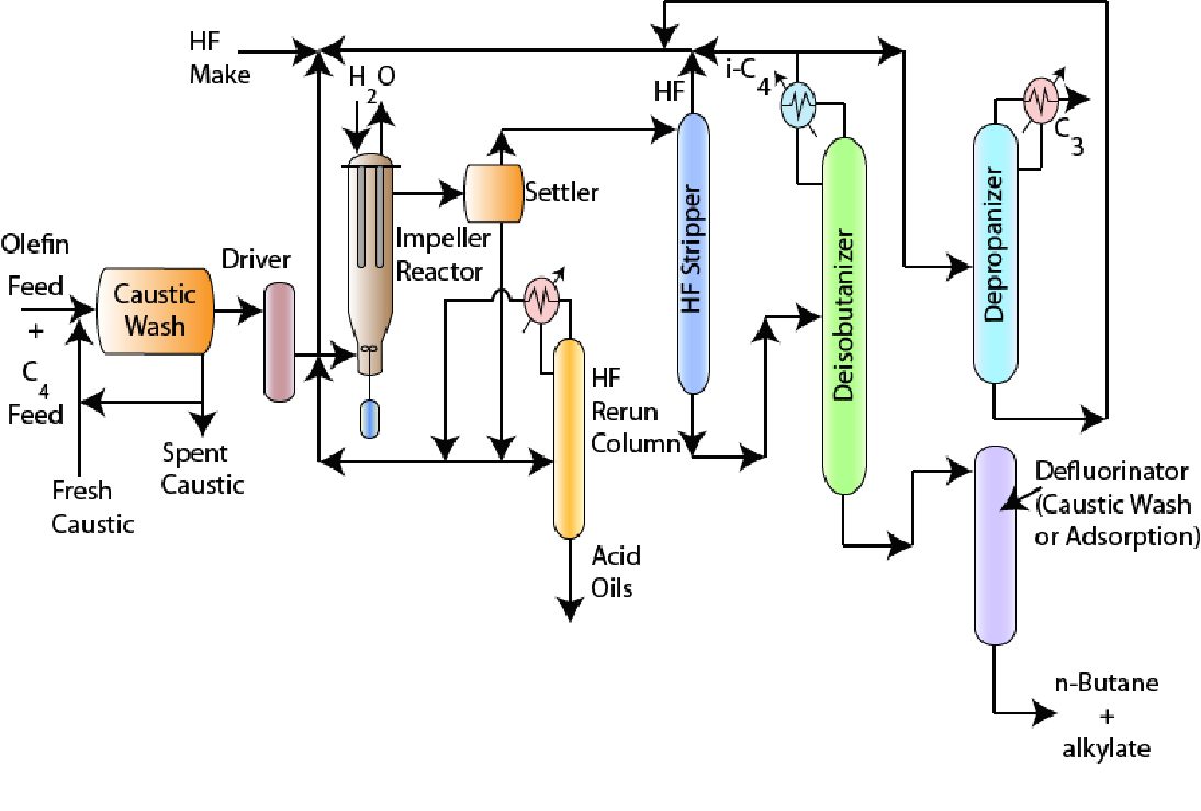 • The alkylate product is sent to a deisobutanizer and depropanizer units. The final alkylate product is produced by using a deflourinator which is basically a caustic wash or adsorption unit. Finally n-butane + alkylate is produced as the bottom product.