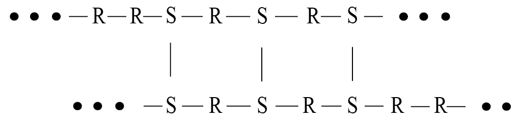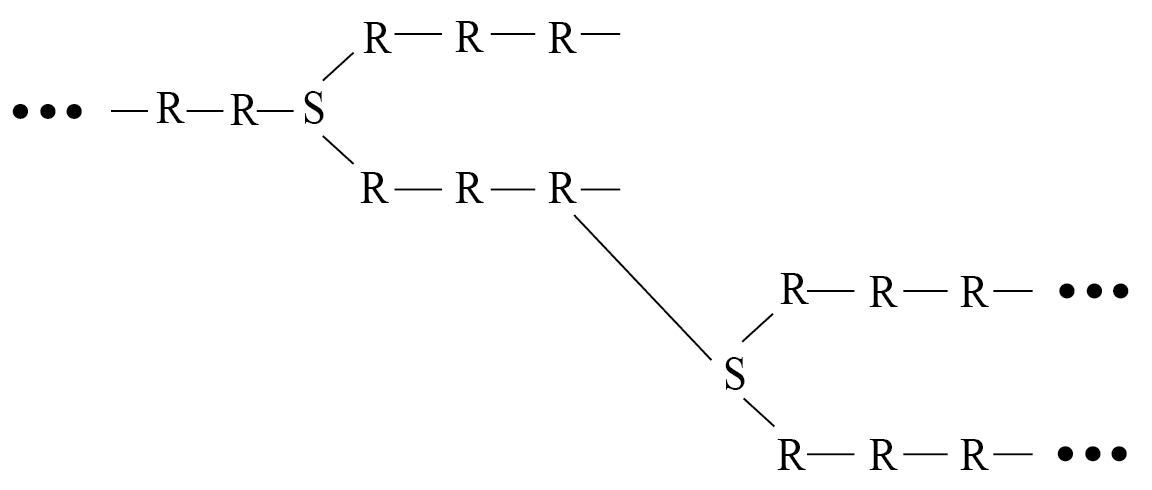 b. Cross –linked polymers : These polymers have a 3-D network structure. Only bi-functional and tri-functional monomers can form cross-linked polymers. Elastomeric properties are generally endowed in polymers have cross-linkage across the linear chains.