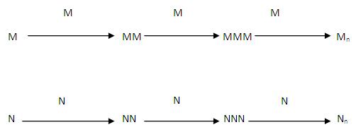 If we consider ‘M' and ‘N' be two monomeric species, then the chain addition reaction can be of the following types –