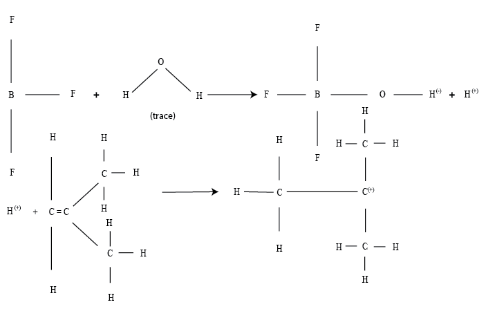 These are similar to chain addition reaction with free radicals , however ; instead of neutral, unpaired electrons, they have a positive or negative charge. A co-catalyst may be used, which is usually a trace of H2O, which is necessary to produce ionization, as the reaction cannot occur in absolute dry conditions.