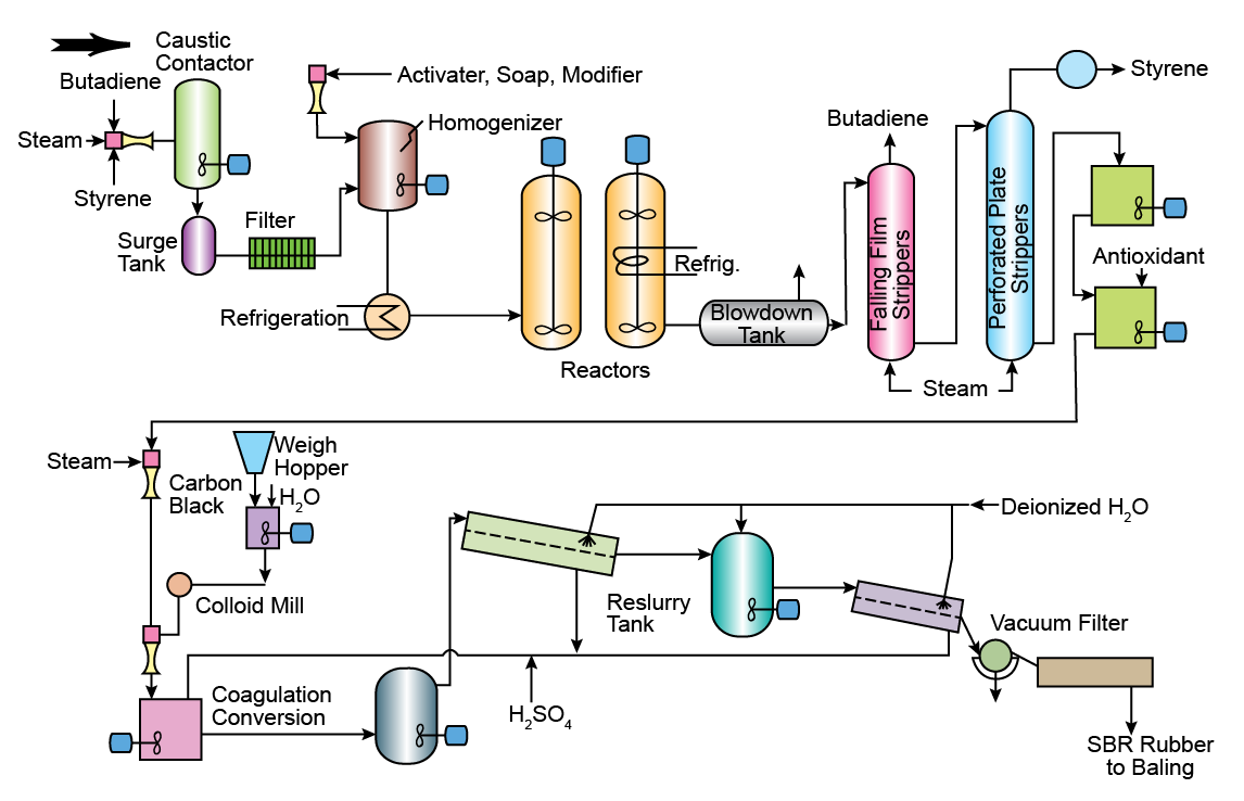 The fresh and recycle monomers are purified by 20 % aqueous caustic purification. Then the stream is continuously passed through 6 to 12 glass – lined or stainless steel reactors. The residence time in these reactors ranges from 5 to 15 hours. Steam heating, water cooling and refrigeration are carried out in these reactors. These reactors are equipped for producing both cold and hot SBR. Cold SBR is produced at 5°C and 1 atm gage by refrigeration techniques ; whereas hot SBR is manufactured at 50°C , and 3-4 atm gage.