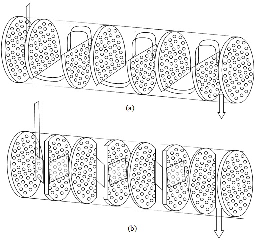 Fig.8.7: Baffles; (a) horizontal cut baffles; (b) Vertical cut baffles; (c, d and e)the shaded region show the baffle area