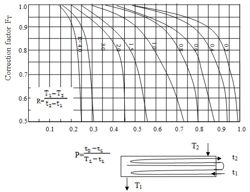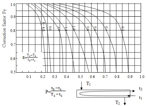 FT, the LMTD correction factor can be directly obtained from available charts in the literature. These charts were prepared from the results obtained theoretically by solving the temperature distribution in multi-pass heat exchangers.