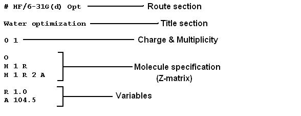 For doing a calculation in Gaussian03, an input file is required. The input file contains the route section, information about the molecular charge and multiplicity, and definitions of the molecular structure given in Z-matrix. All this information is used to calculate the total number of electrons and the orbital occupancies. Shown in Fig. 1.6 below is a sample input file for geometry optimization of water molecule.
