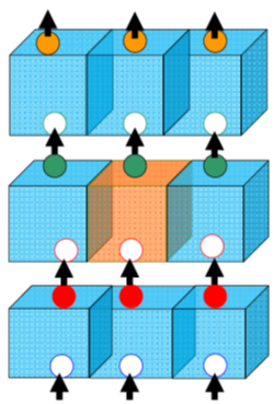 Figure 6 Periodic boundary conditions in a three dimensional view. The orange colour box is the central simulation box. All other boxes are the images of the original simulation box. The particles move in and out as shown with arrows.
