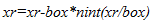 In the first step the distance between each pair of particle i.e i and j are calculated and stored in xr. A cut-off distance of rc is chosen in such a manner so that the force computation is neglected for pairs which has distance more than this distance. This cut-off distance is usually half the distance of the periodic box (here denoted by box).Thus for the force calculation the distance between the particle i and the nearest image j should be less than box/2.The nint(x) rounds the integer to the nearest whole number[Frenkel and Smit,2002]. Thus the distance between I and the nearest image j is calculated via